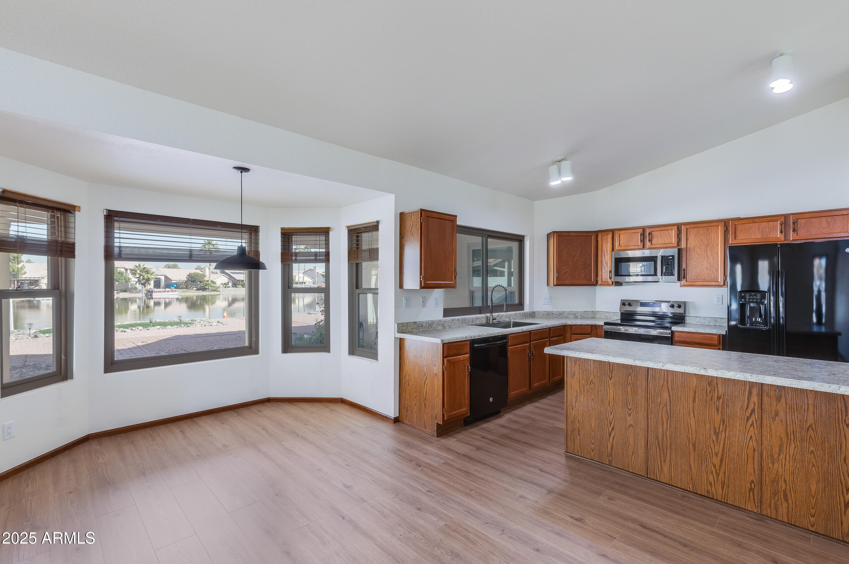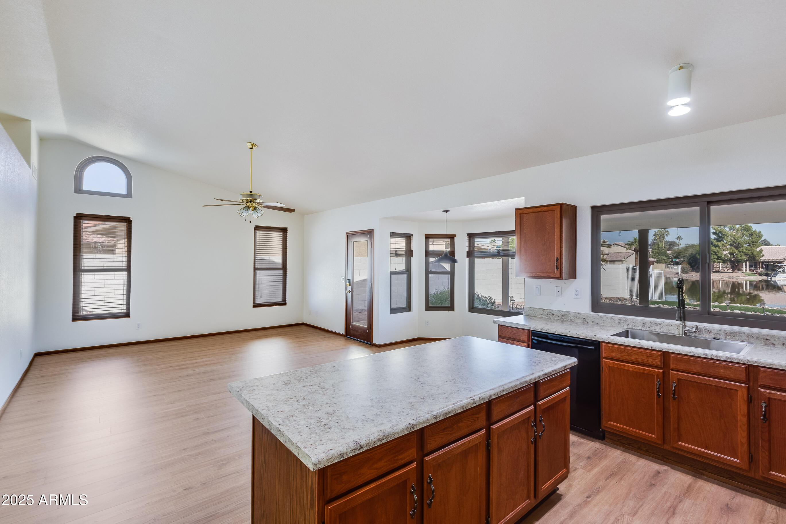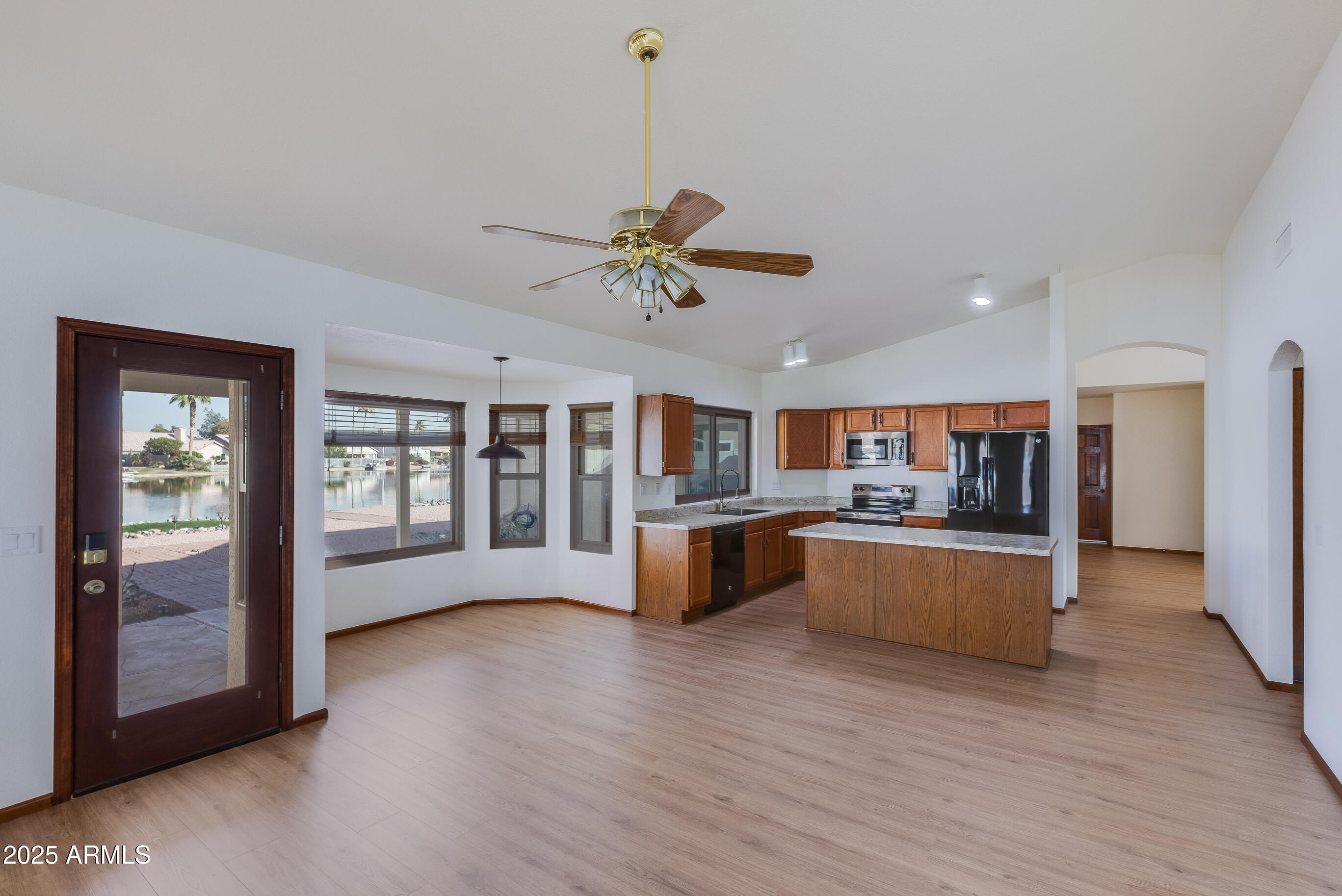 Welcome to lakeside living in desirable Garden Lakes! This 3-bedroom home, with an office/den, offers a thoughtful floor plan featuring formal living and dining rooms, plus a cozy family room off the kitchen with vaulted ceilings throughout. Recent upgrades include stunning wood-style luxury vinyl flooring, a freshly painted interior, brand-new kitchen countertops, range, microwave, and disposal. Enjoy peace of mind with a roof underlayment replaced in 2013. The North-South exposure fills the home with natural light, while the serene lakefront setting provides tranquil views. A spacious 2-car garage completes this must-see property. Don't miss the chance to make it yours!
