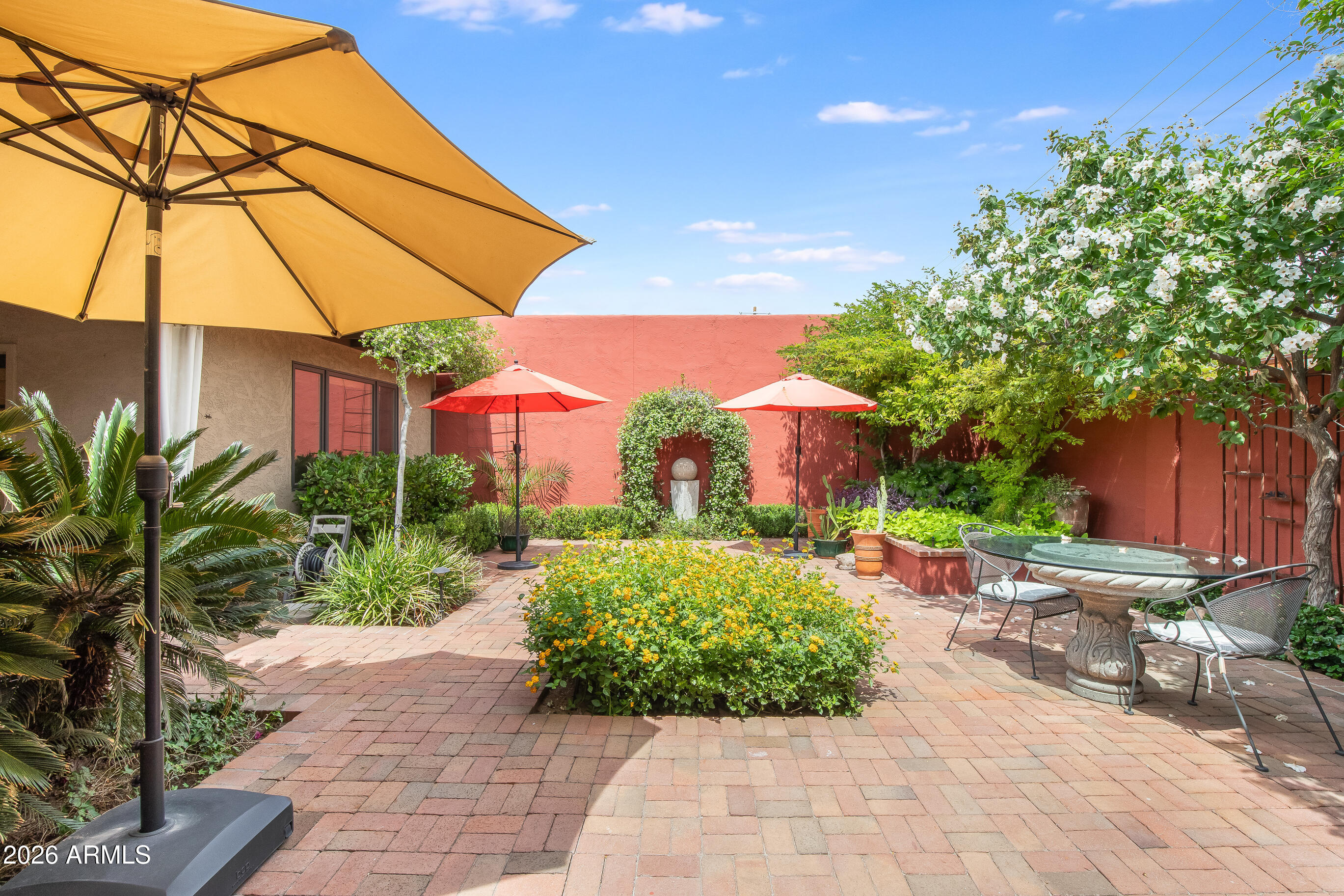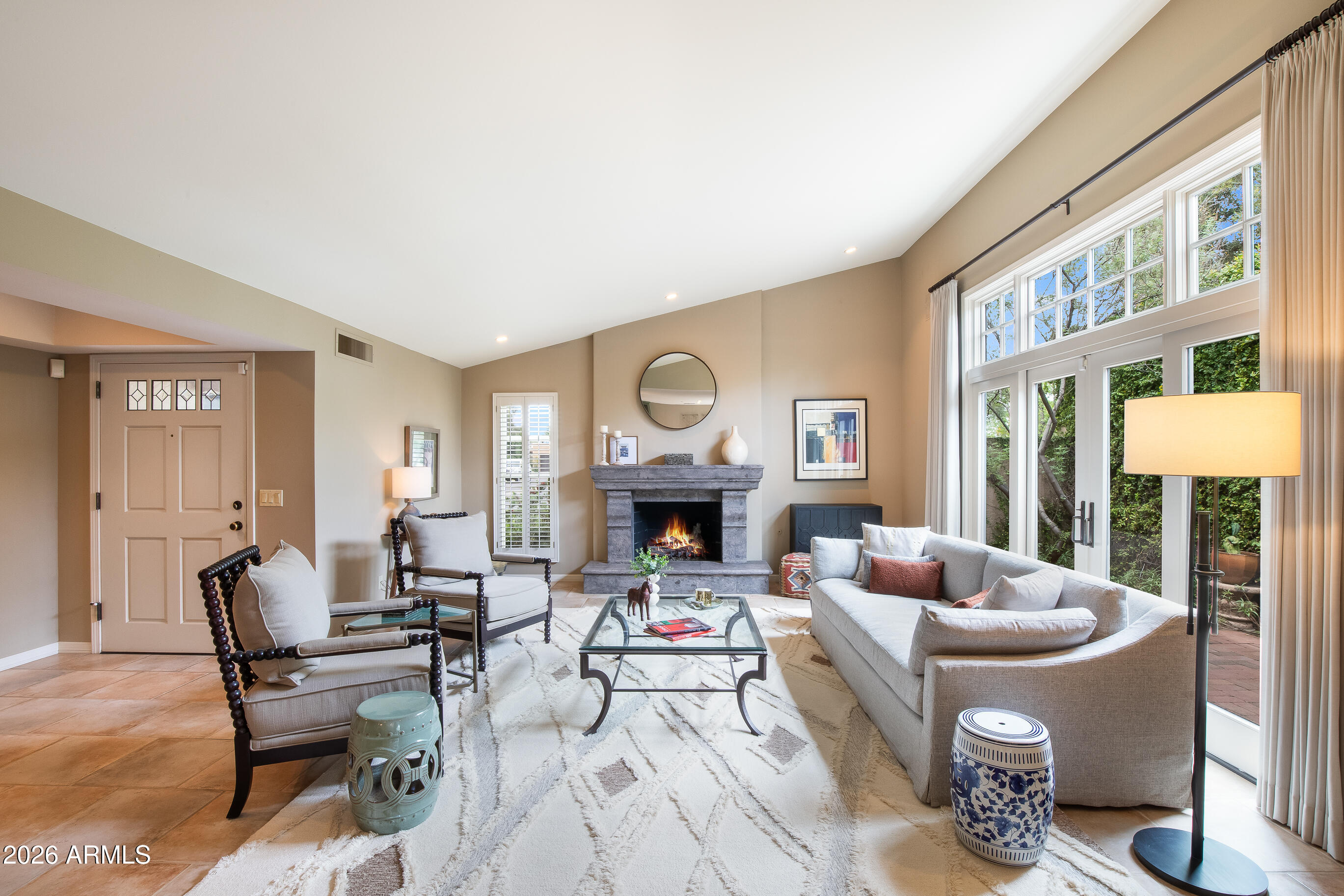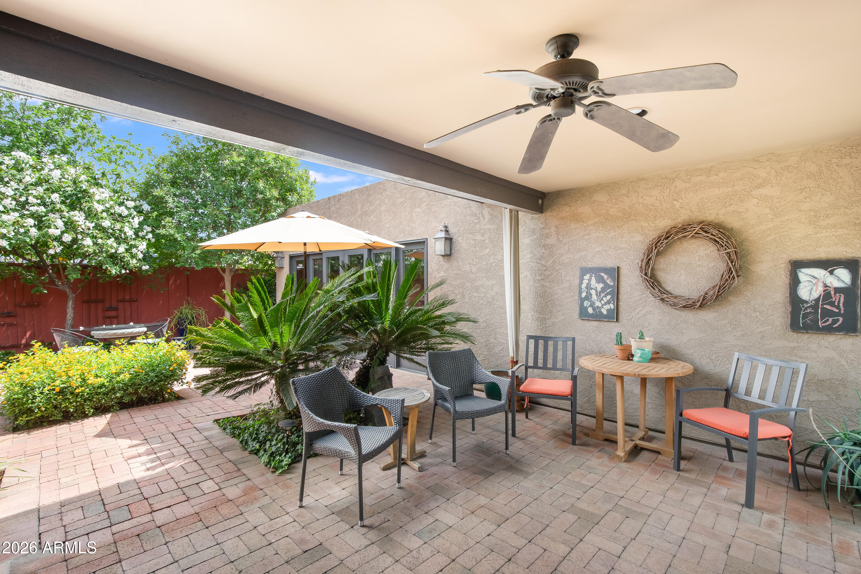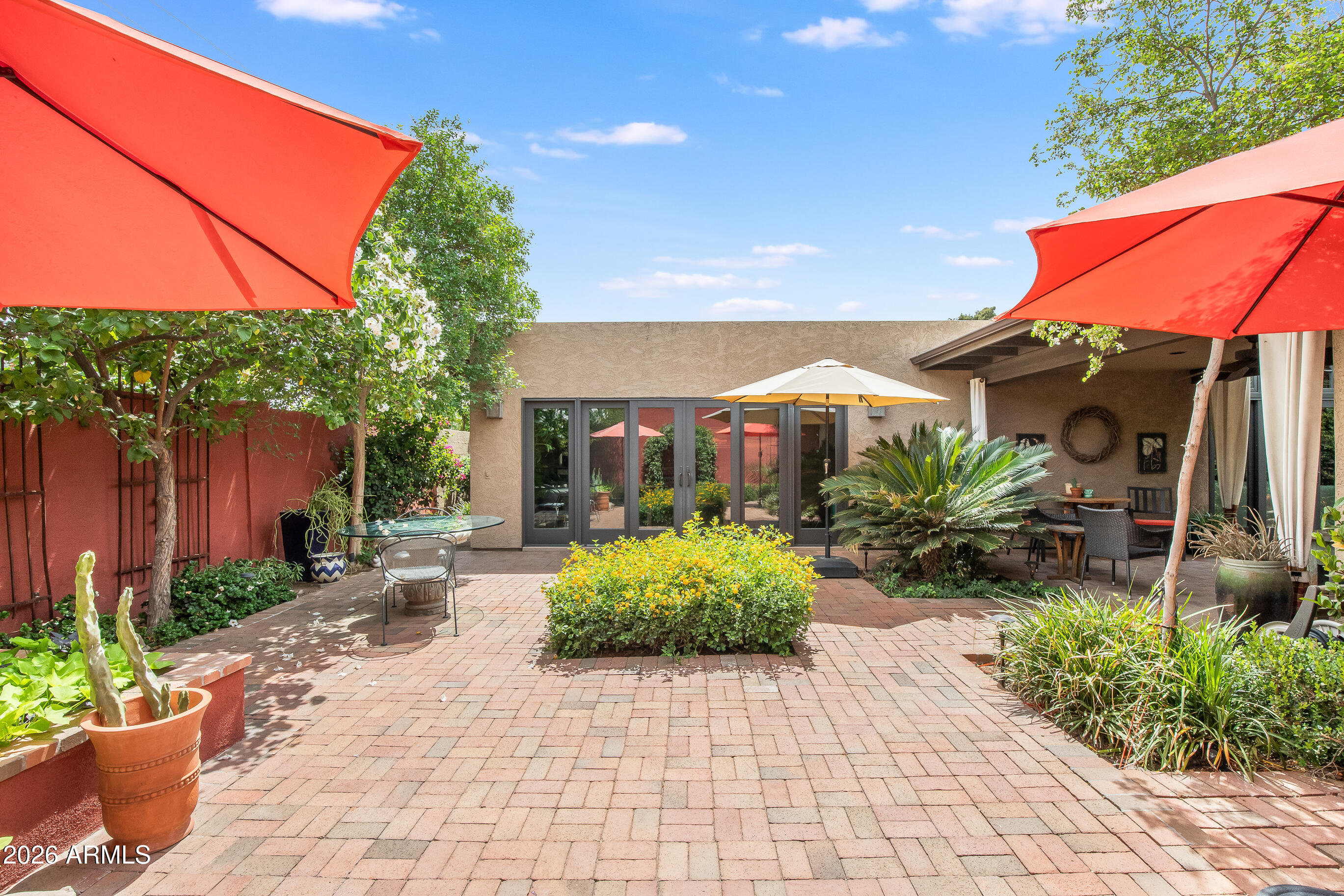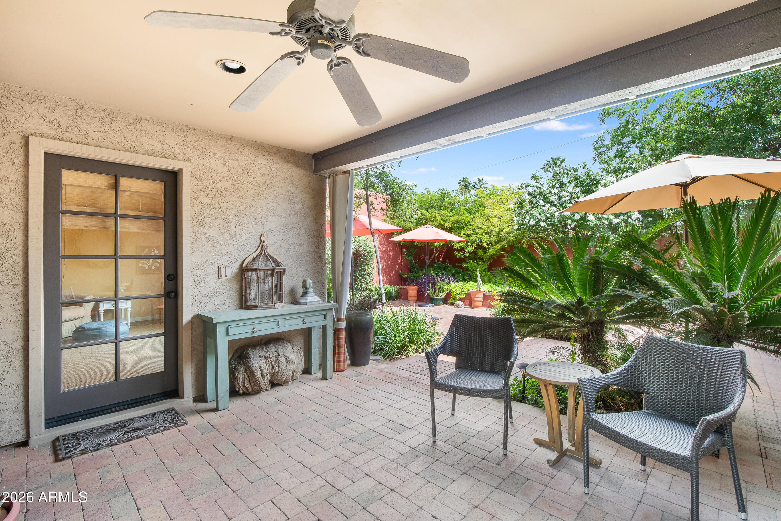 La Plaza Hermosa is a private oasis in the heart of North Central Phoenix, centered around a lush park setting. This single-level home offers refined, lock-&-leave living in one of the area's most coveted gated communities. Vaulted ceilings, abundant natural light, & multiple sliding glass doors create seamless indoor-outdoor flow. Designer finishes include Pella dual-pane windows, Sub-Zero refrigerator, Viking gas range, custom cabinetry, recessed lighting, & a striking gas fireplace. The serene primary suite features wood-beamed ceilings, a sitting area & patio access. The 2BR + den main home (2,086 sq ft) is complemented by a detached 182 sq ft studio with mini-split--ideal for office or gym. Lush, magazine-worthy courtyard& prime access to dining, shopping, & the Murphy Bridle Path