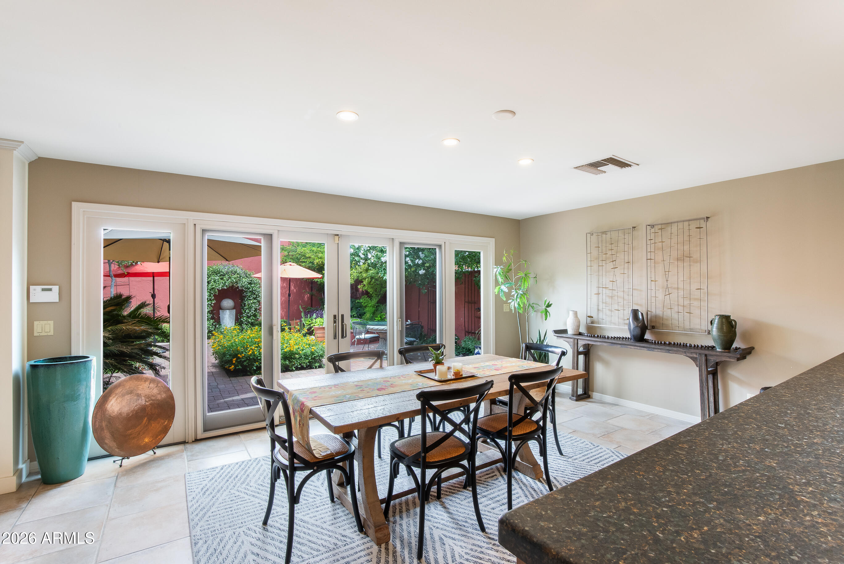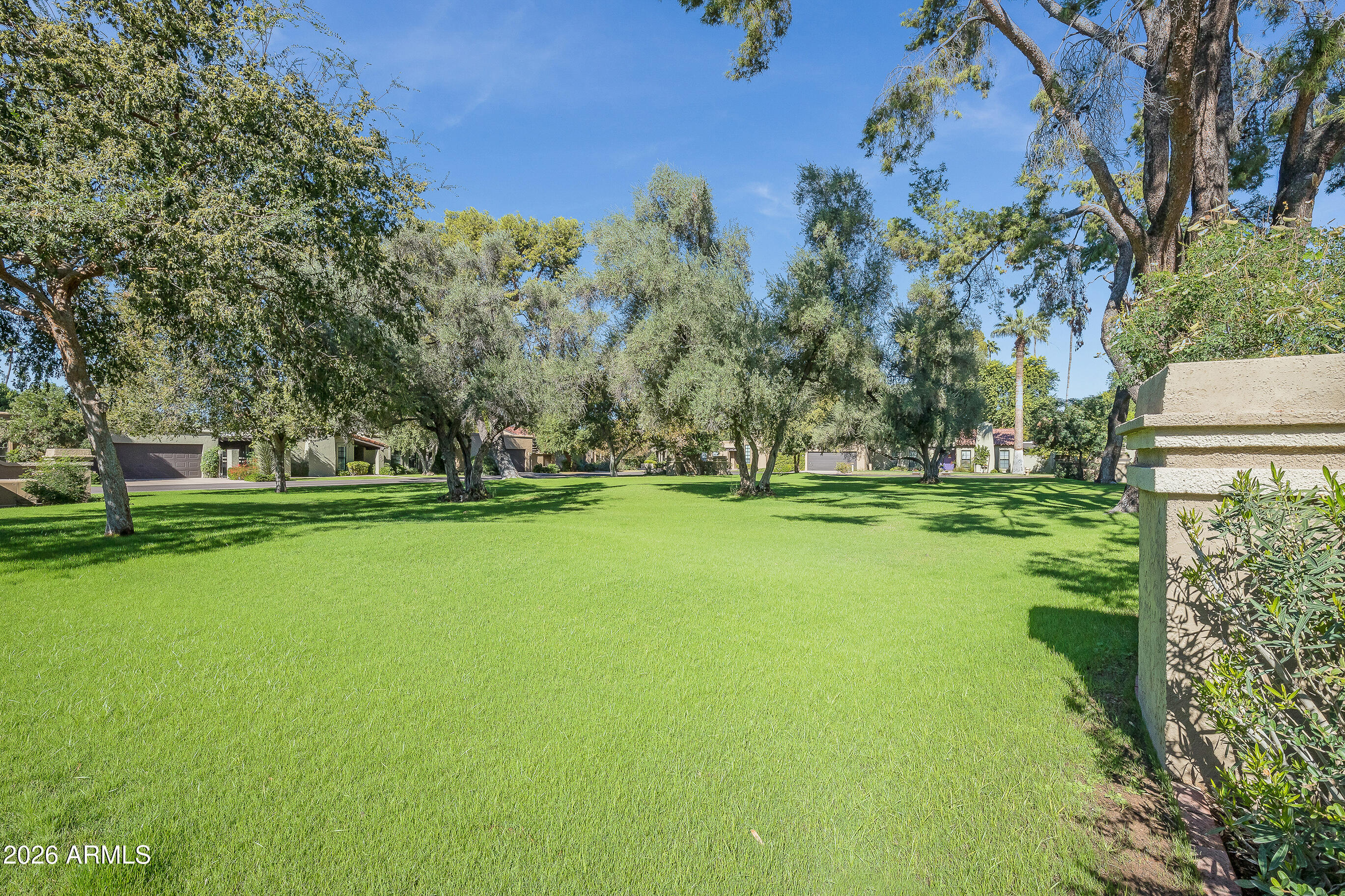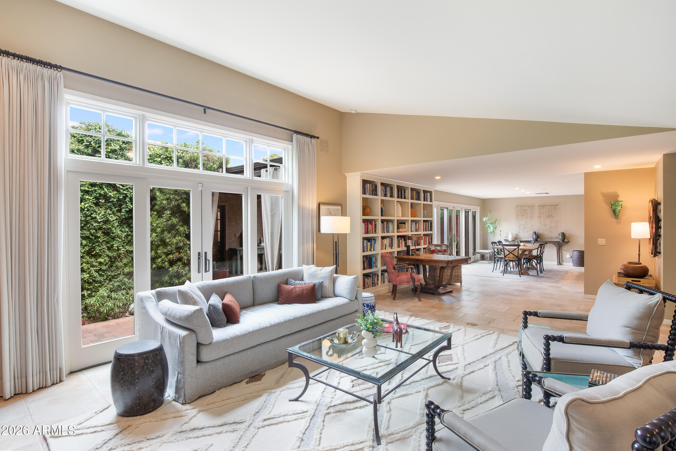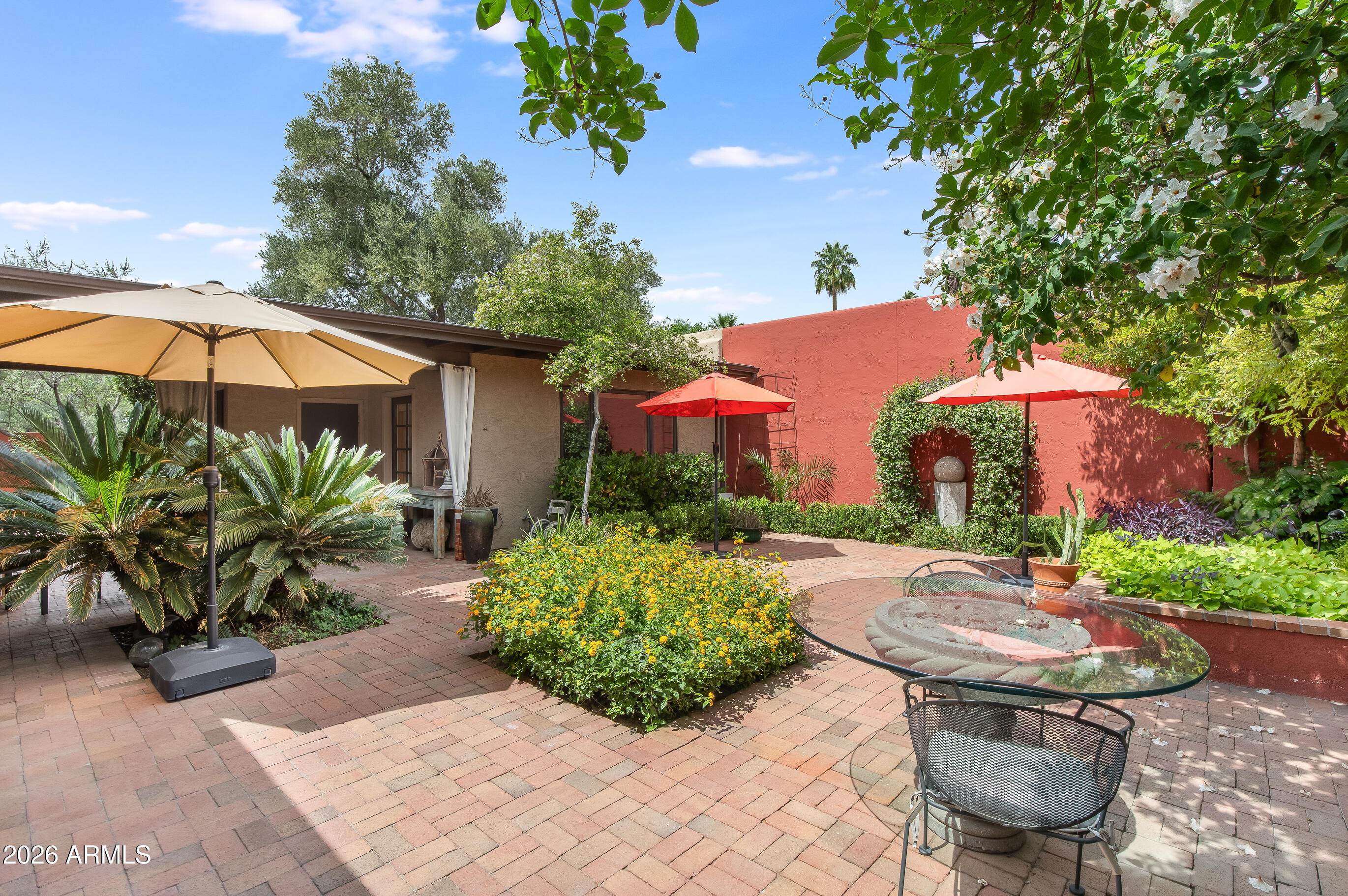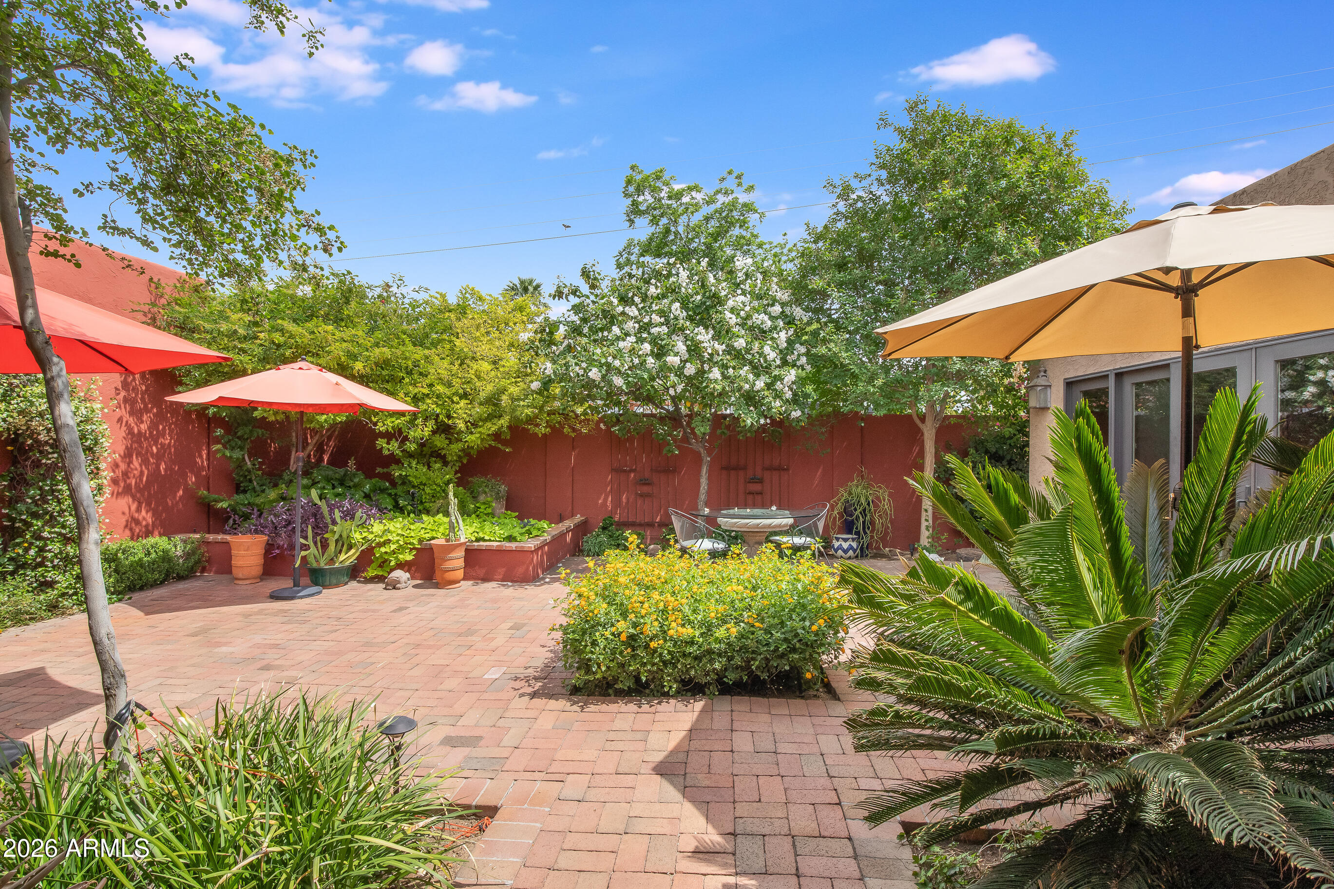 La Plaza Hermosa is a private oasis in the heart of North Central Phoenix, centered around a lush park setting. This single-level home offers refined, lock-&-leave living in one of the area's most coveted gated communities. Vaulted ceilings, abundant natural light, & multiple sliding glass doors create seamless indoor-outdoor flow. Designer finishes include Pella dual-pane windows, Sub-Zero refrigerator, Viking gas range, custom cabinetry, recessed lighting, & a striking gas fireplace. The serene primary suite features wood-beamed ceilings, a sitting area & patio access. The 2BR + den main home (2,086 sq ft) is complemented by a detached 182 sq ft studio with mini-split--ideal for office or gym. Lush, magazine-worthy courtyard& prime access to dining, shopping, & the Murphy Bridle Path