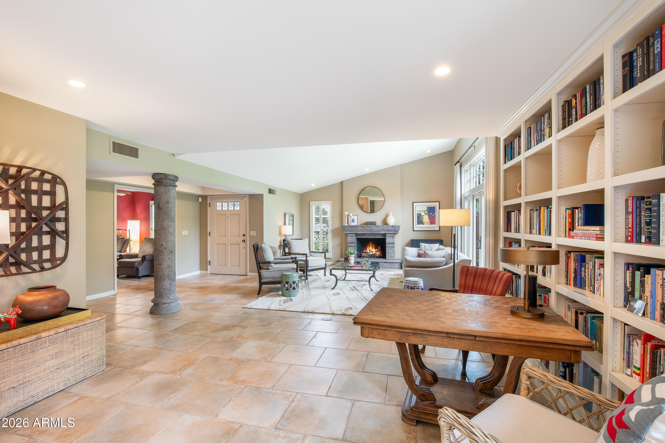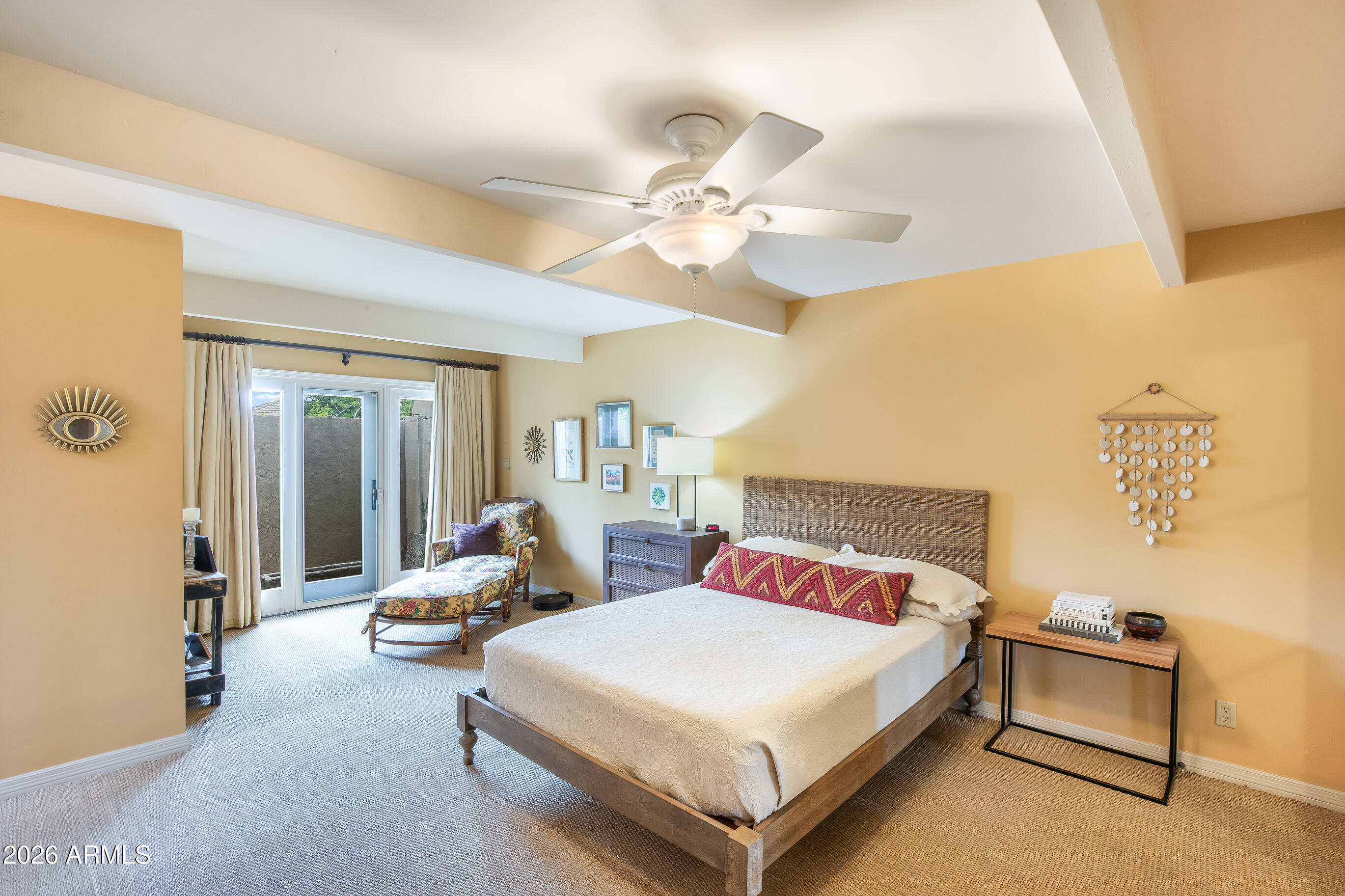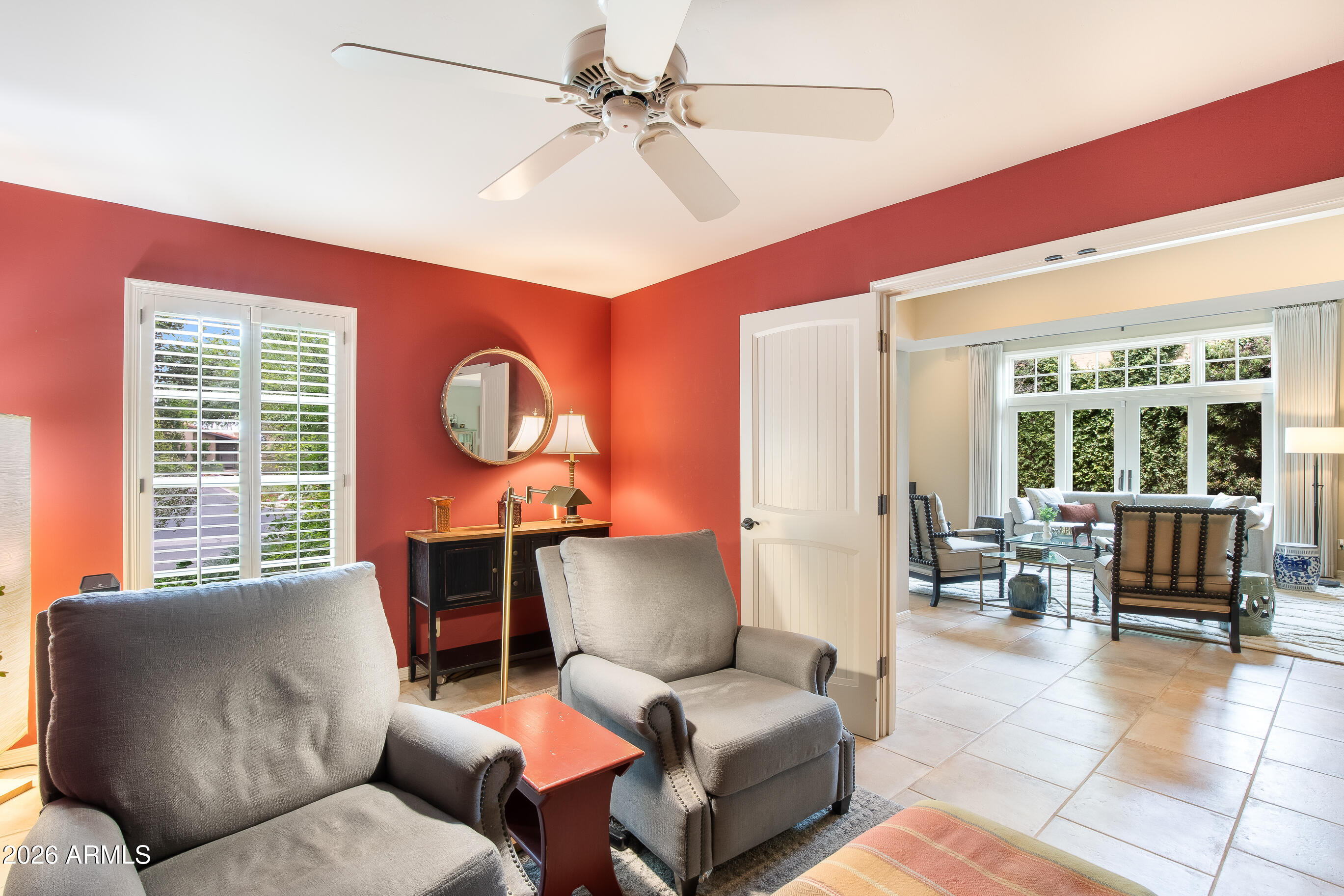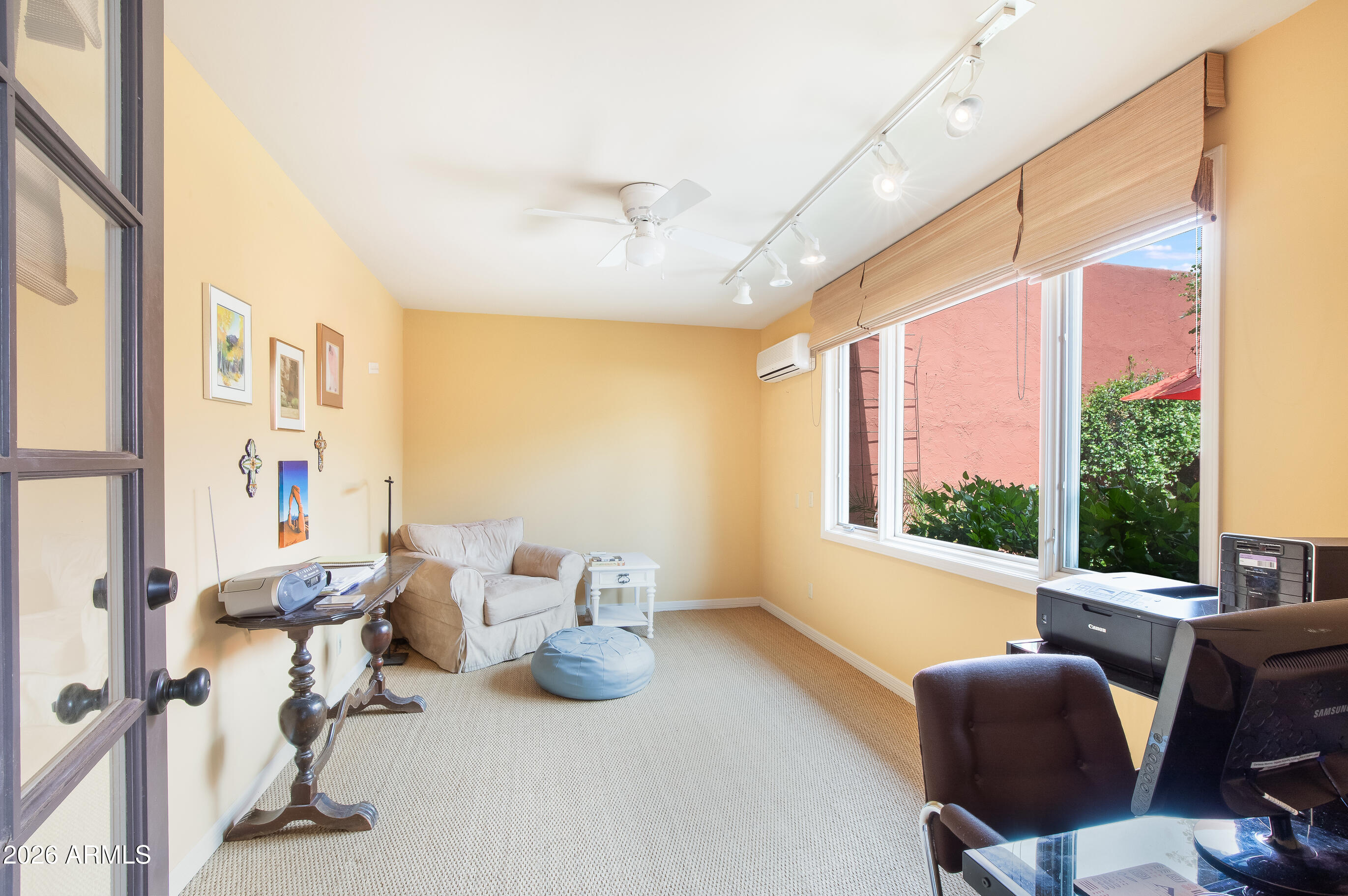 La Plaza Hermosa is a private oasis in the heart of North Central Phoenix, centered around a lush park setting. This single-level home offers refined, lock-&-leave living in one of the area's most coveted gated communities. Vaulted ceilings, abundant natural light, & multiple sliding glass doors create seamless indoor-outdoor flow. Designer finishes include Pella dual-pane windows, Sub-Zero refrigerator, Viking gas range, custom cabinetry, recessed lighting, & a striking gas fireplace. The serene primary suite features wood-beamed ceilings, a sitting area & patio access. The 2BR + den main home (2,086 sq ft) is complemented by a detached 182 sq ft studio with mini-split--ideal for office or gym. Lush, magazine-worthy courtyard& prime access to dining, shopping, & the Murphy Bridle Path