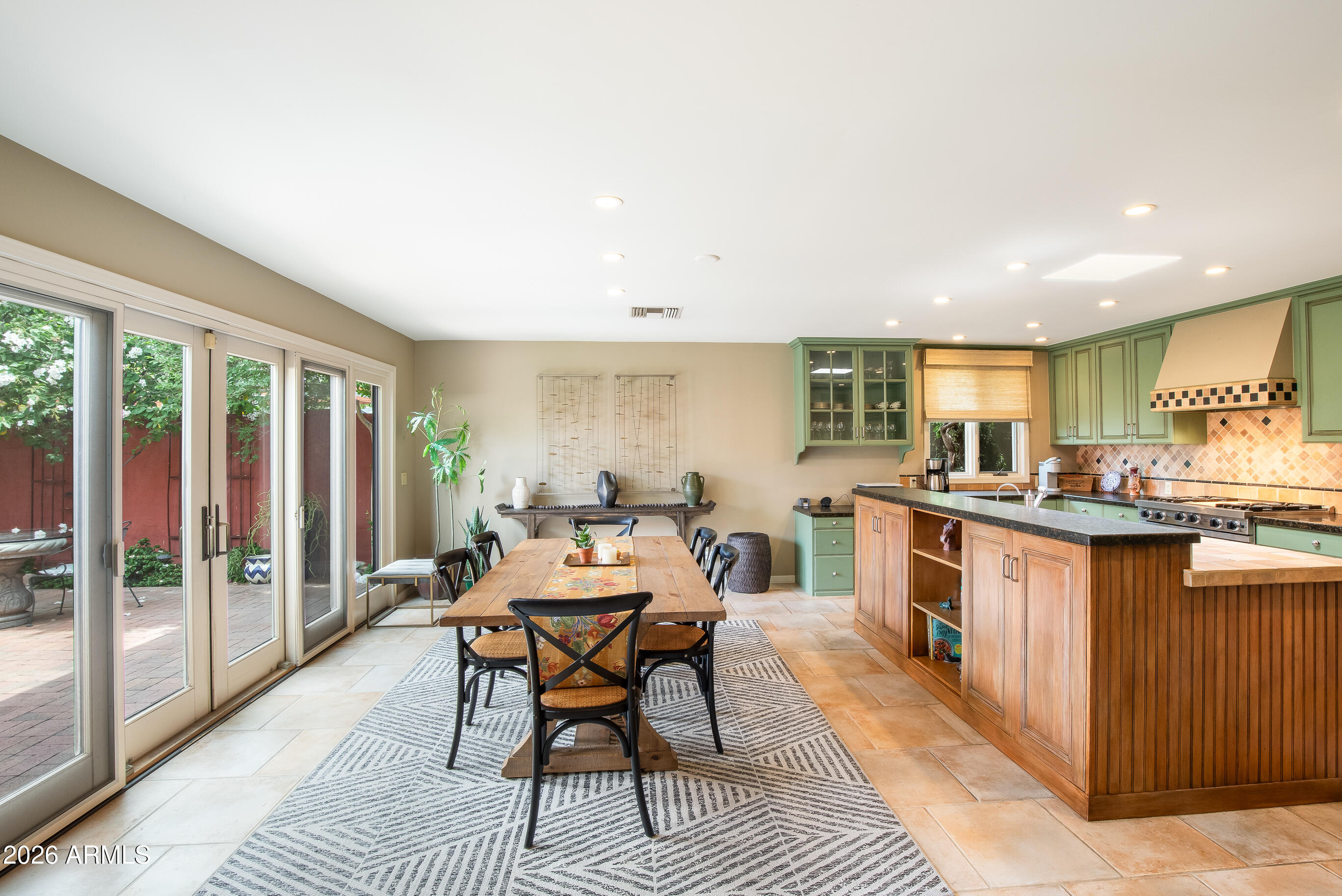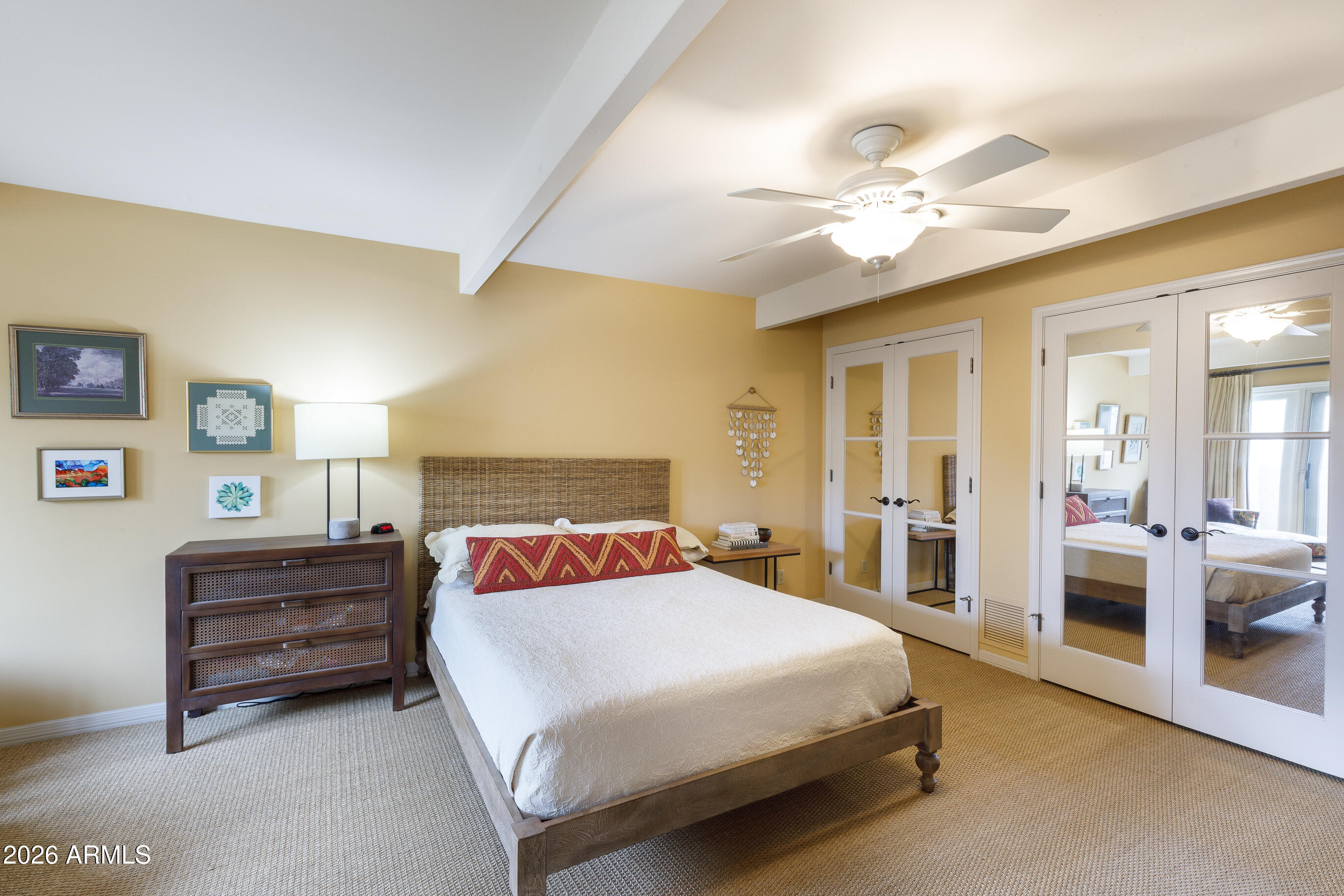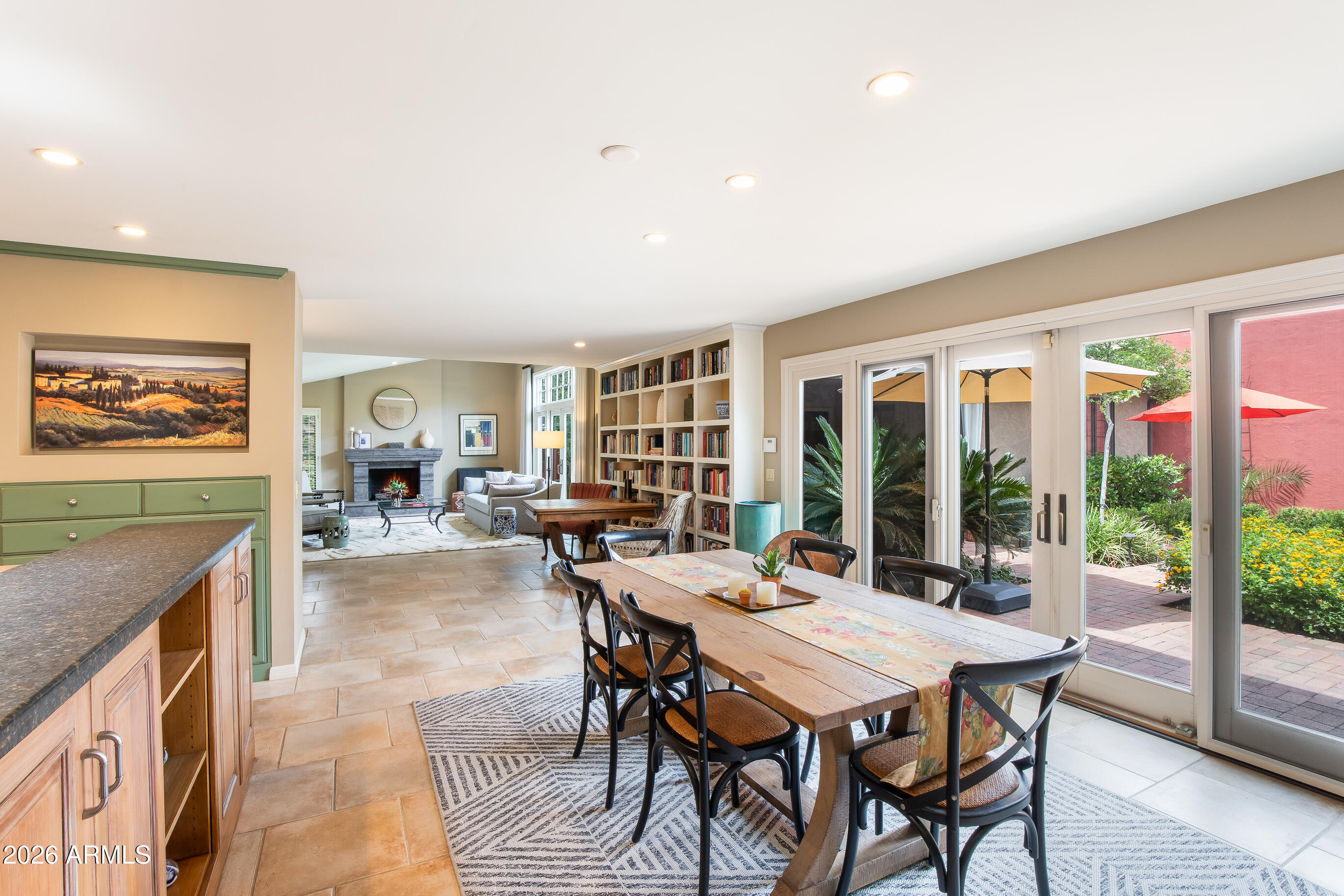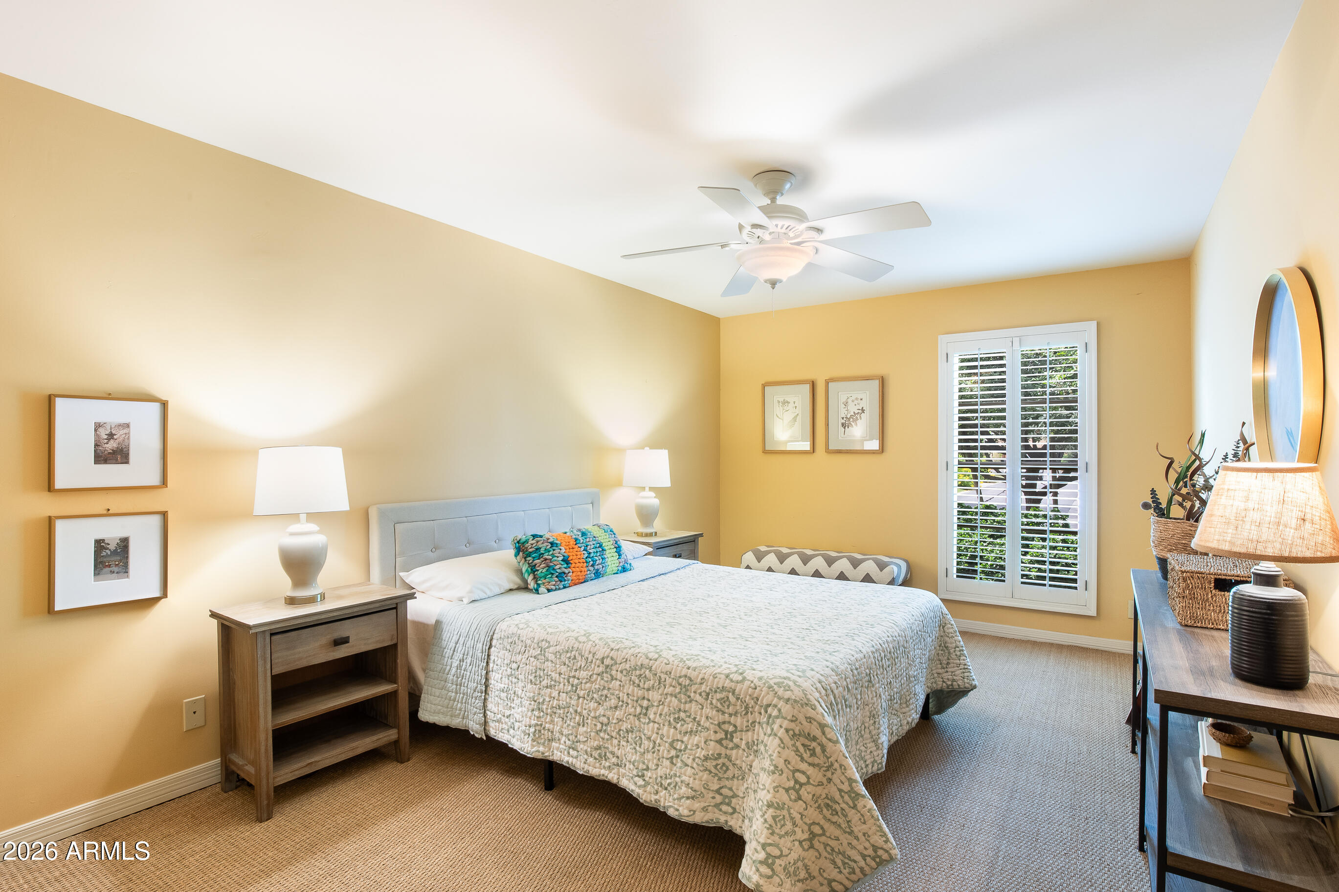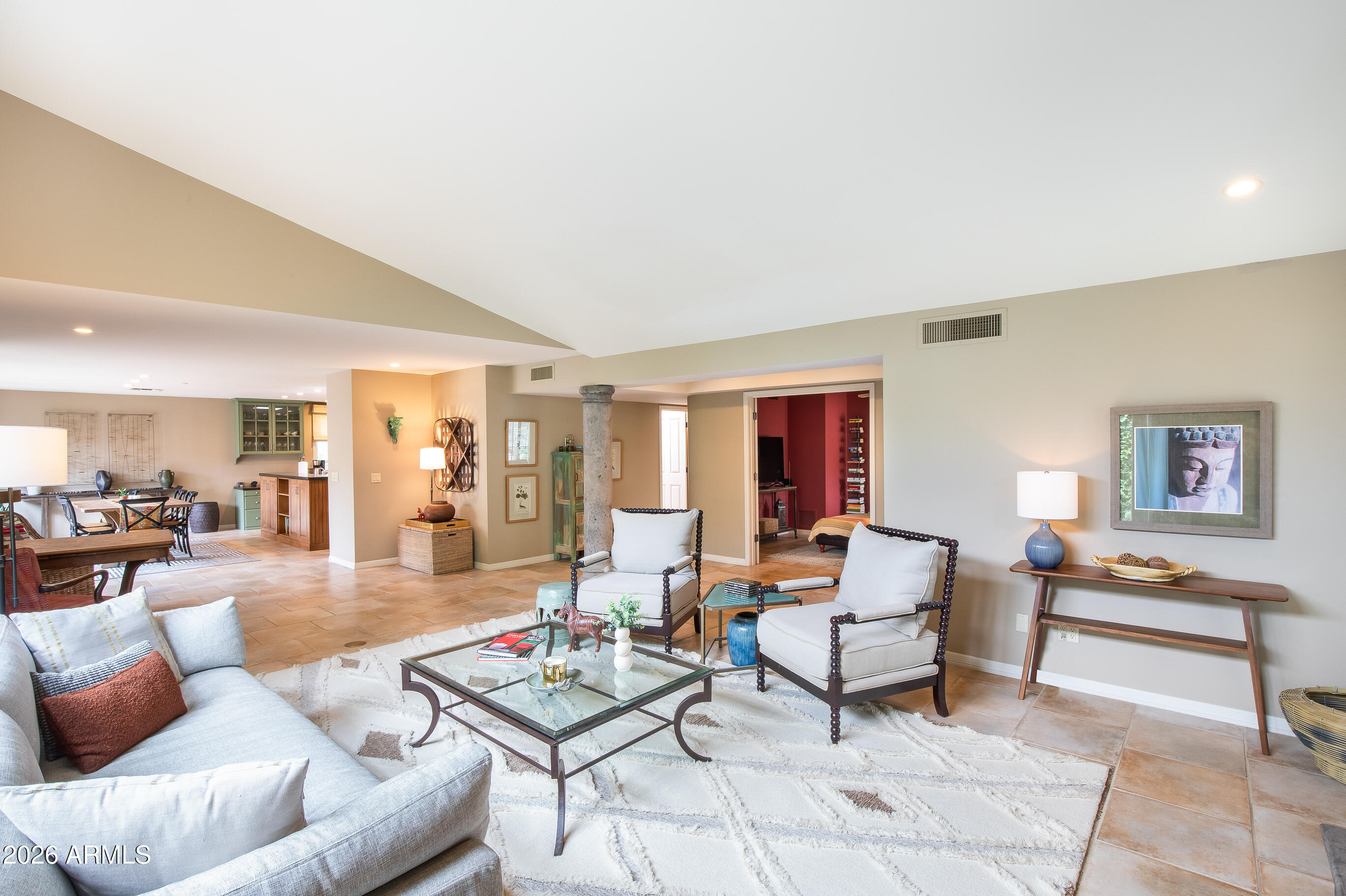 La Plaza Hermosa is a private oasis in the heart of North Central Phoenix, centered around a lush park setting. This single-level home offers refined, lock-&-leave living in one of the area's most coveted gated communities. Vaulted ceilings, abundant natural light, & multiple sliding glass doors create seamless indoor-outdoor flow. Designer finishes include Pella dual-pane windows, Sub-Zero refrigerator, Viking gas range, custom cabinetry, recessed lighting, & a striking gas fireplace. The serene primary suite features wood-beamed ceilings, a sitting area & patio access. The 2BR + den main home (2,086 sq ft) is complemented by a detached 182 sq ft studio with mini-split--ideal for office or gym. Lush, magazine-worthy courtyard& prime access to dining, shopping, & the Murphy Bridle Path