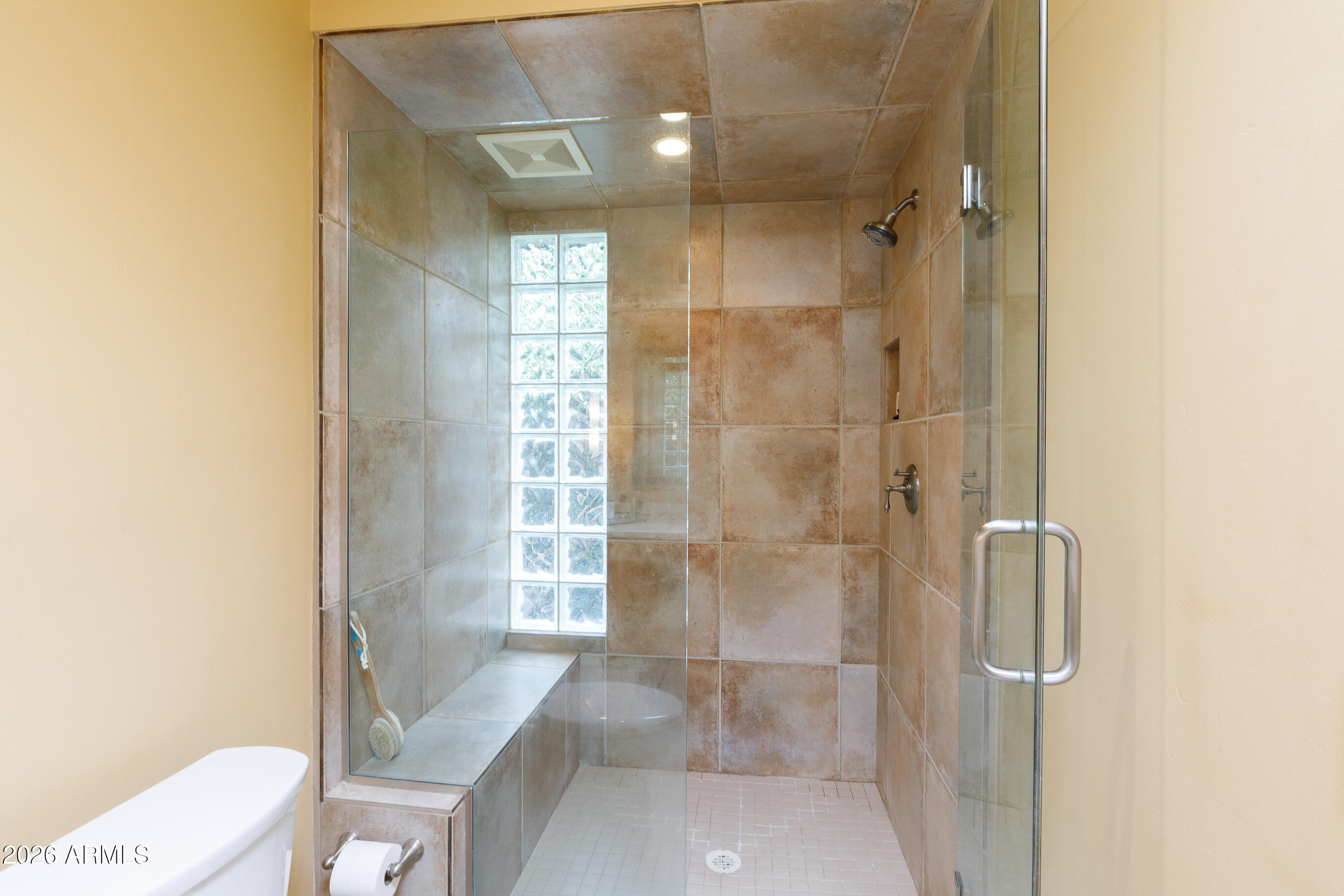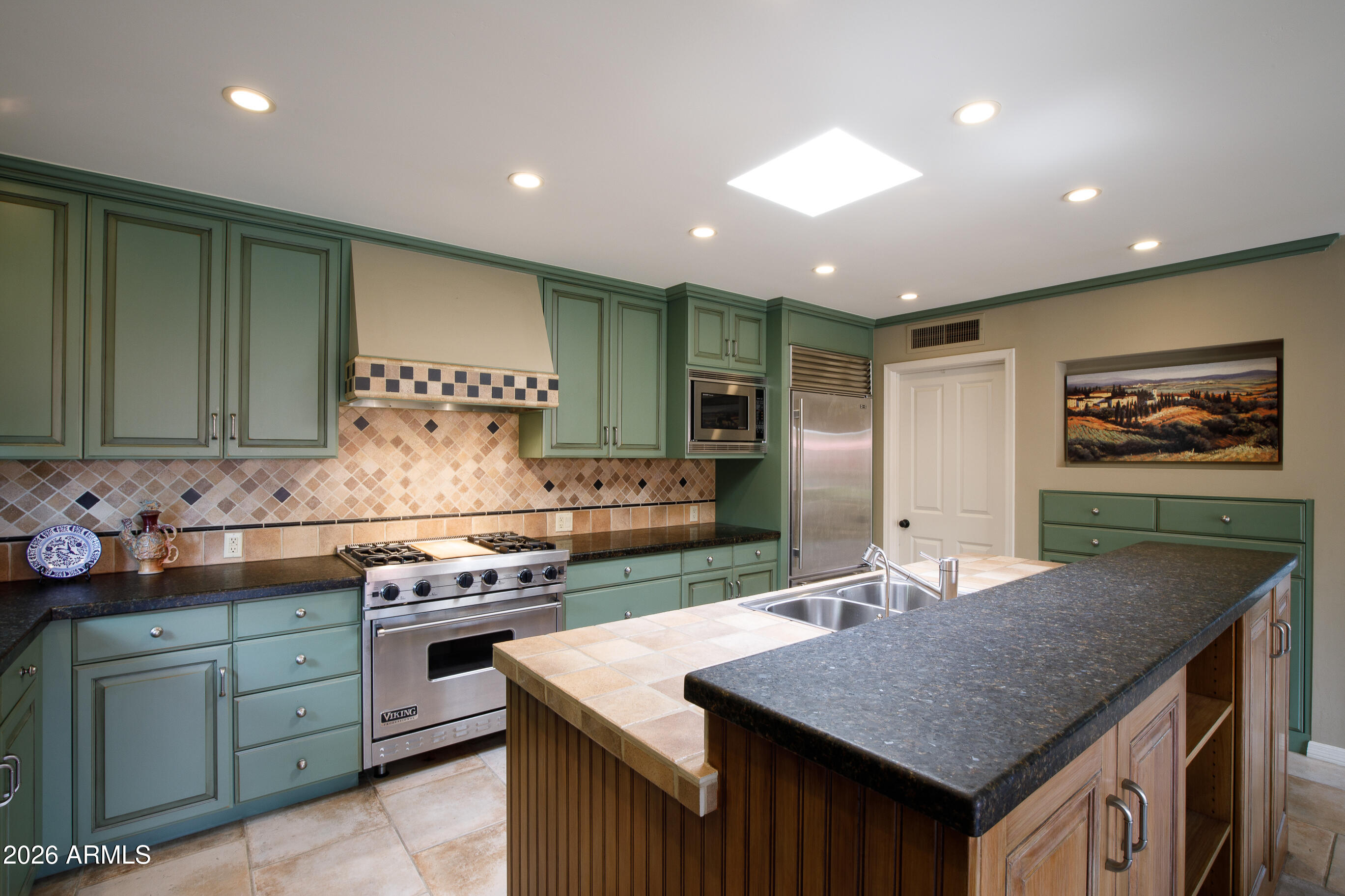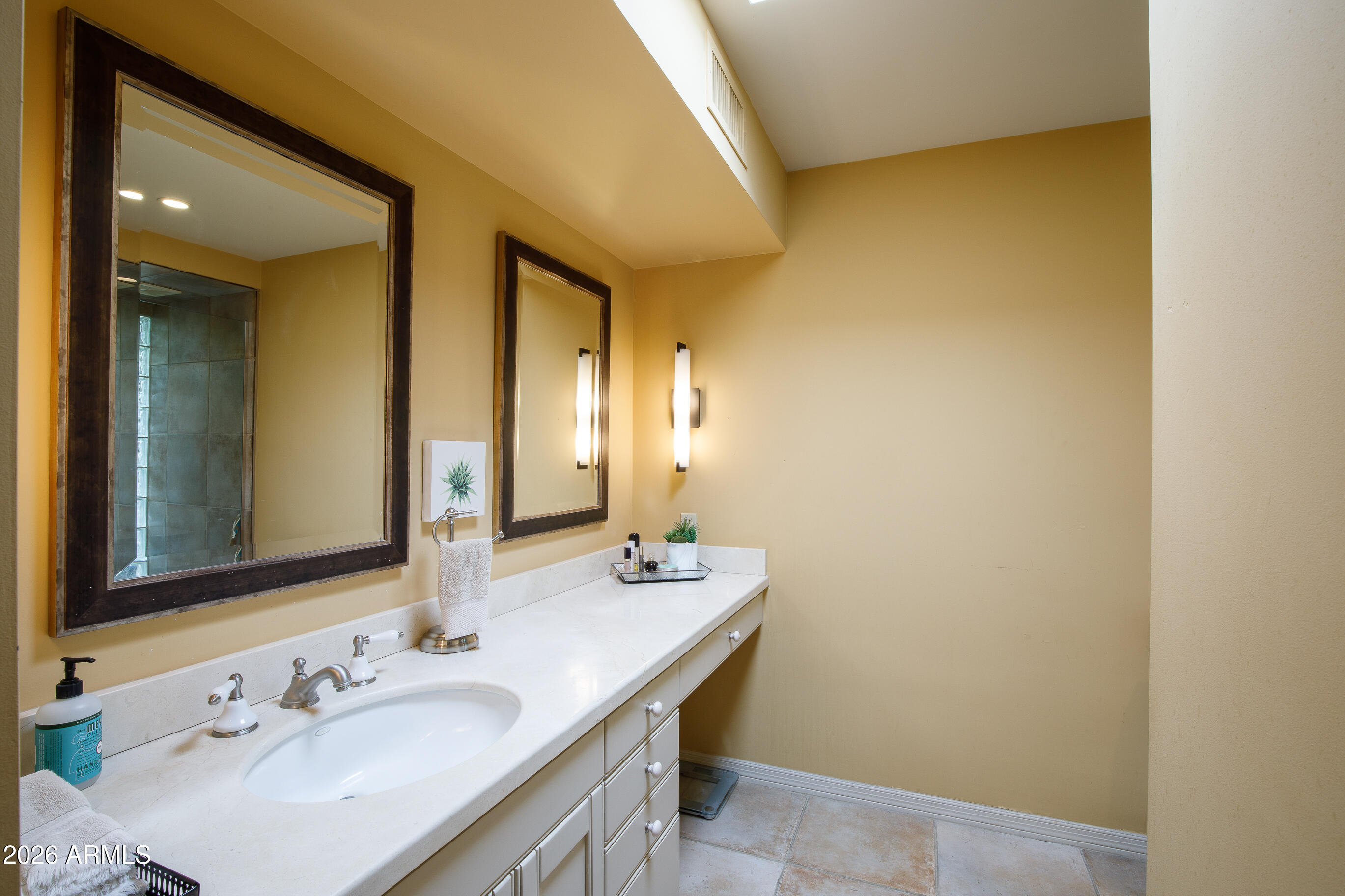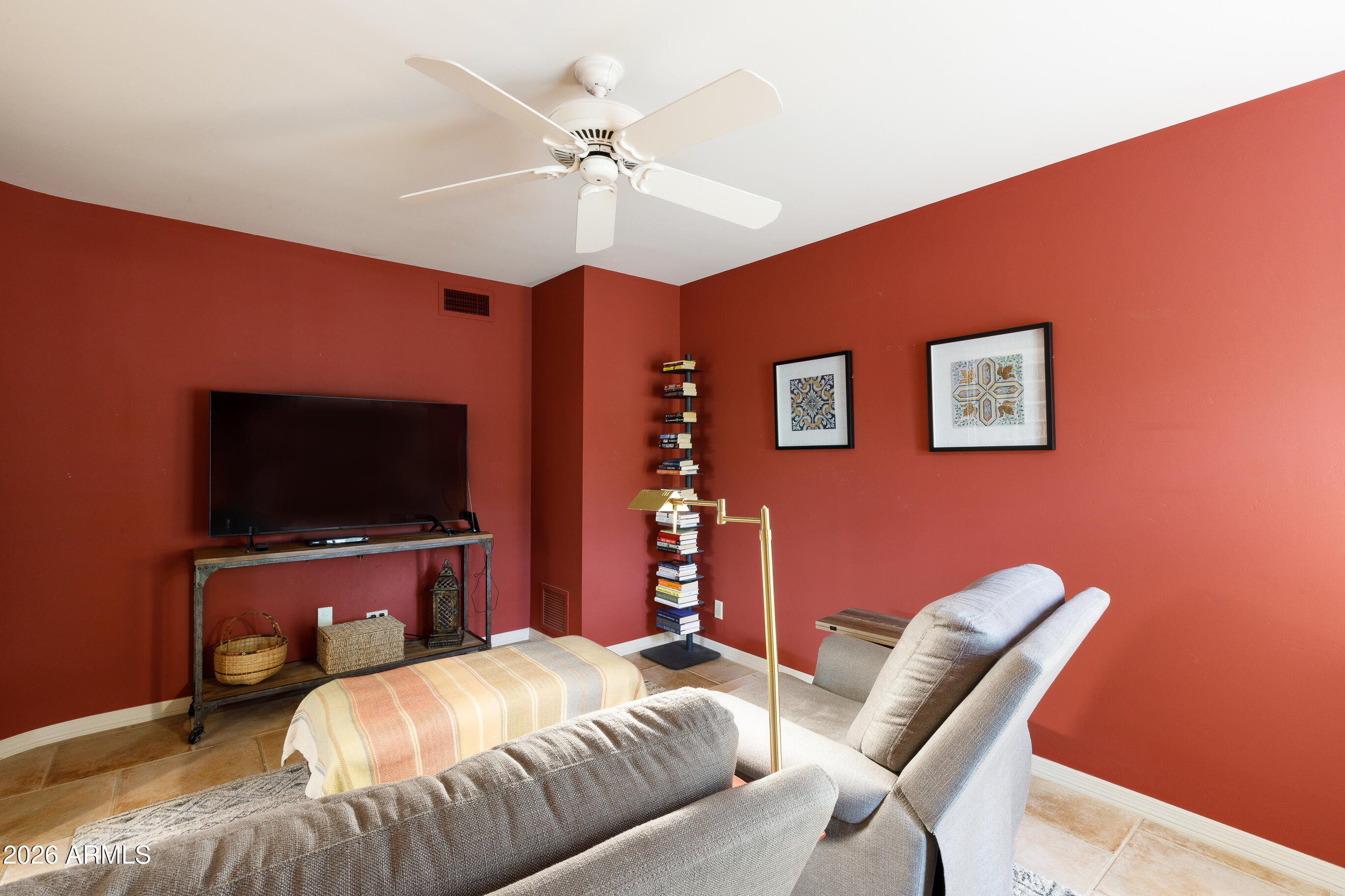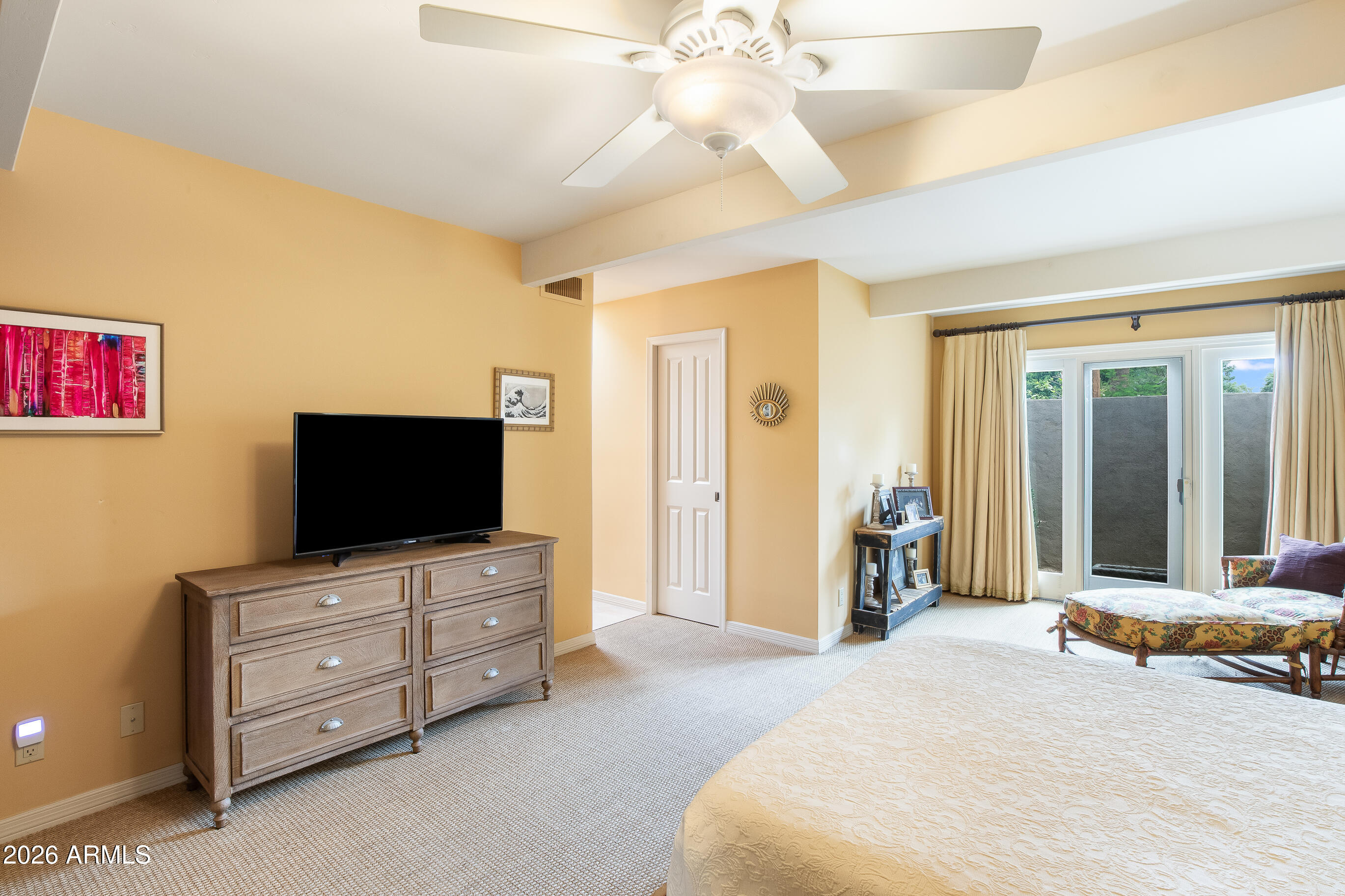 La Plaza Hermosa is a private oasis in the heart of North Central Phoenix, centered around a lush park setting. This single-level home offers refined, lock-&-leave living in one of the area's most coveted gated communities. Vaulted ceilings, abundant natural light, & multiple sliding glass doors create seamless indoor-outdoor flow. Designer finishes include Pella dual-pane windows, Sub-Zero refrigerator, Viking gas range, custom cabinetry, recessed lighting, & a striking gas fireplace. The serene primary suite features wood-beamed ceilings, a sitting area & patio access. The 2BR + den main home (2,086 sq ft) is complemented by a detached 182 sq ft studio with mini-split--ideal for office or gym. Lush, magazine-worthy courtyard& prime access to dining, shopping, & the Murphy Bridle Path
