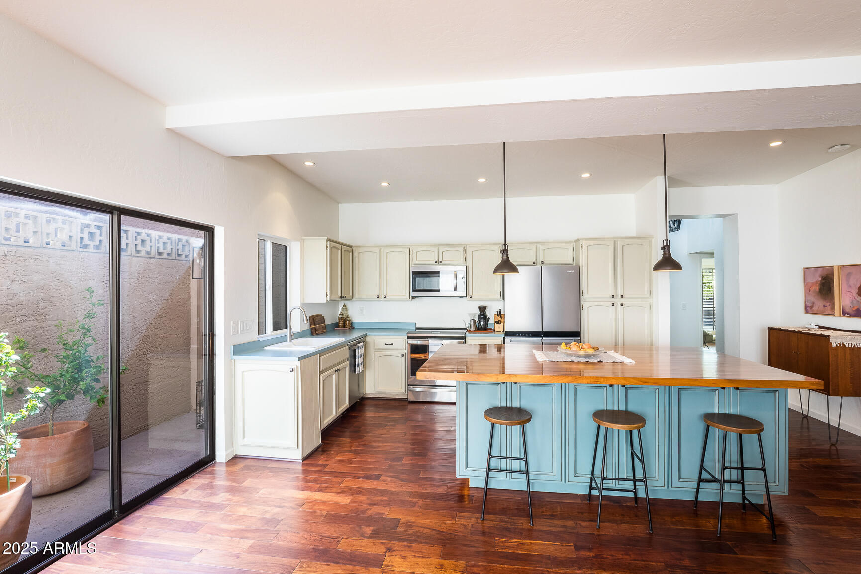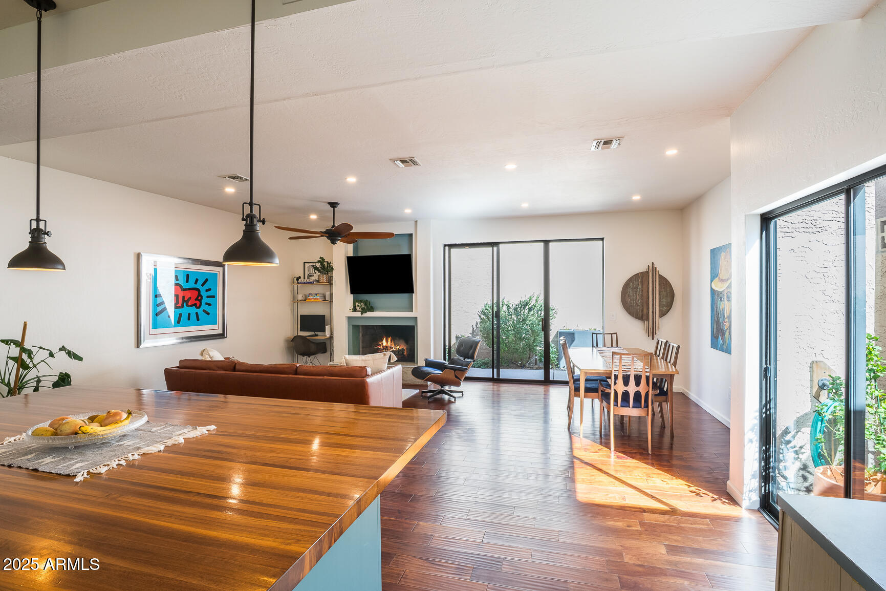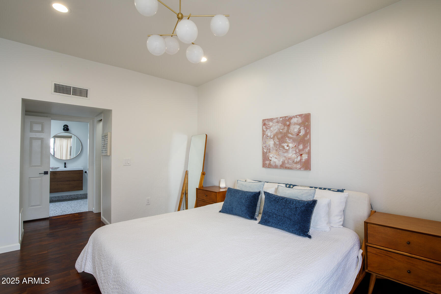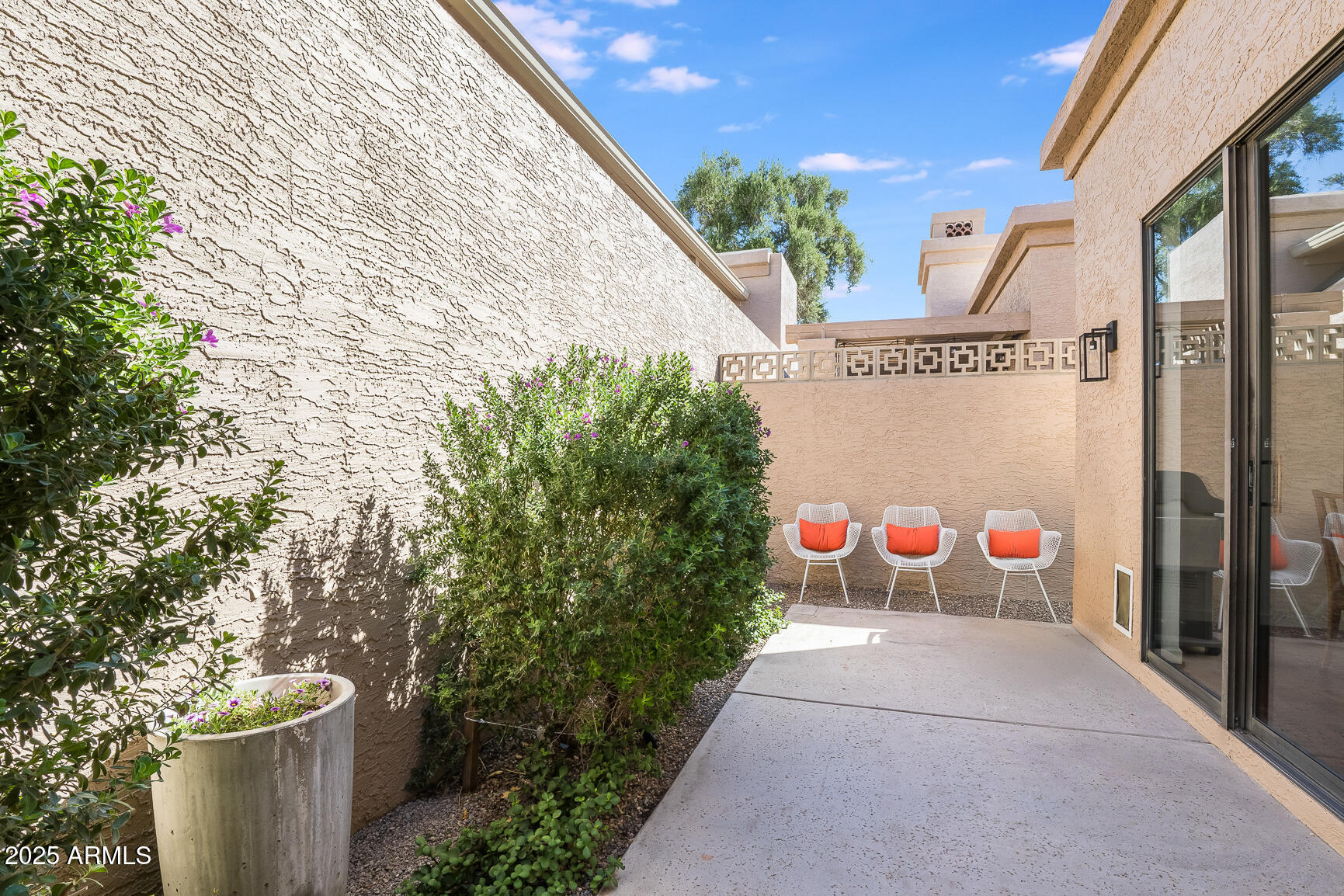 Beautifully maintained 2BR/2BA patio home with open-concept layout, spacious 2-car garage, and modern upgrades throughout. Light-filled interior features a stunning kitchen with custom wood island, fully renovated bathrooms, and thoughtfully designed closets for efficient storage. Large windows and sliders bring in abundant natural light.Roof has had 3 recoats (last in 2024) + new tile roof over entry. Epoxied garage includes EV charger outlet and pull-down access to a cedar-lined, carpeted attic with lighting.Estate Monterra offers a private park and community pool. Prime location near Granada Park with direct access to AZ Canal trails leading to Biltmore, Arcadia, PV & Tempe -- perfect for walking, biking, and outdoor living.