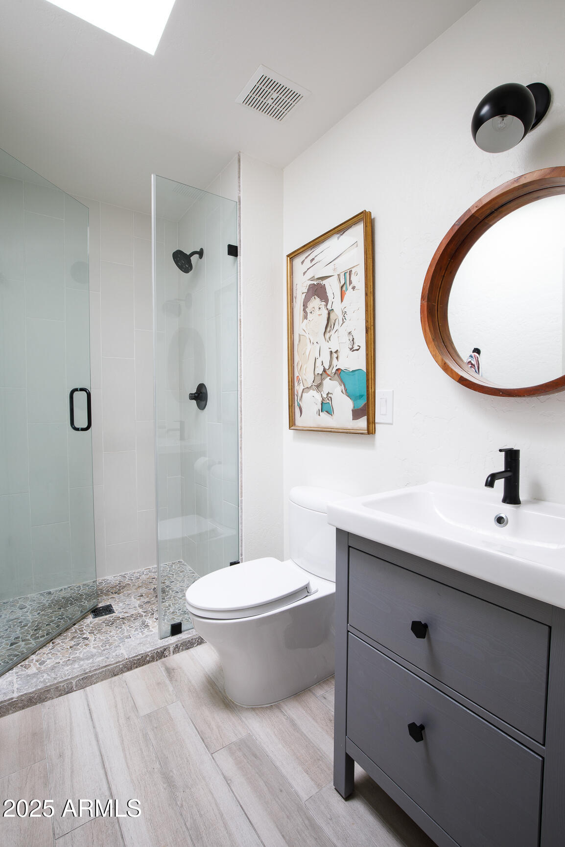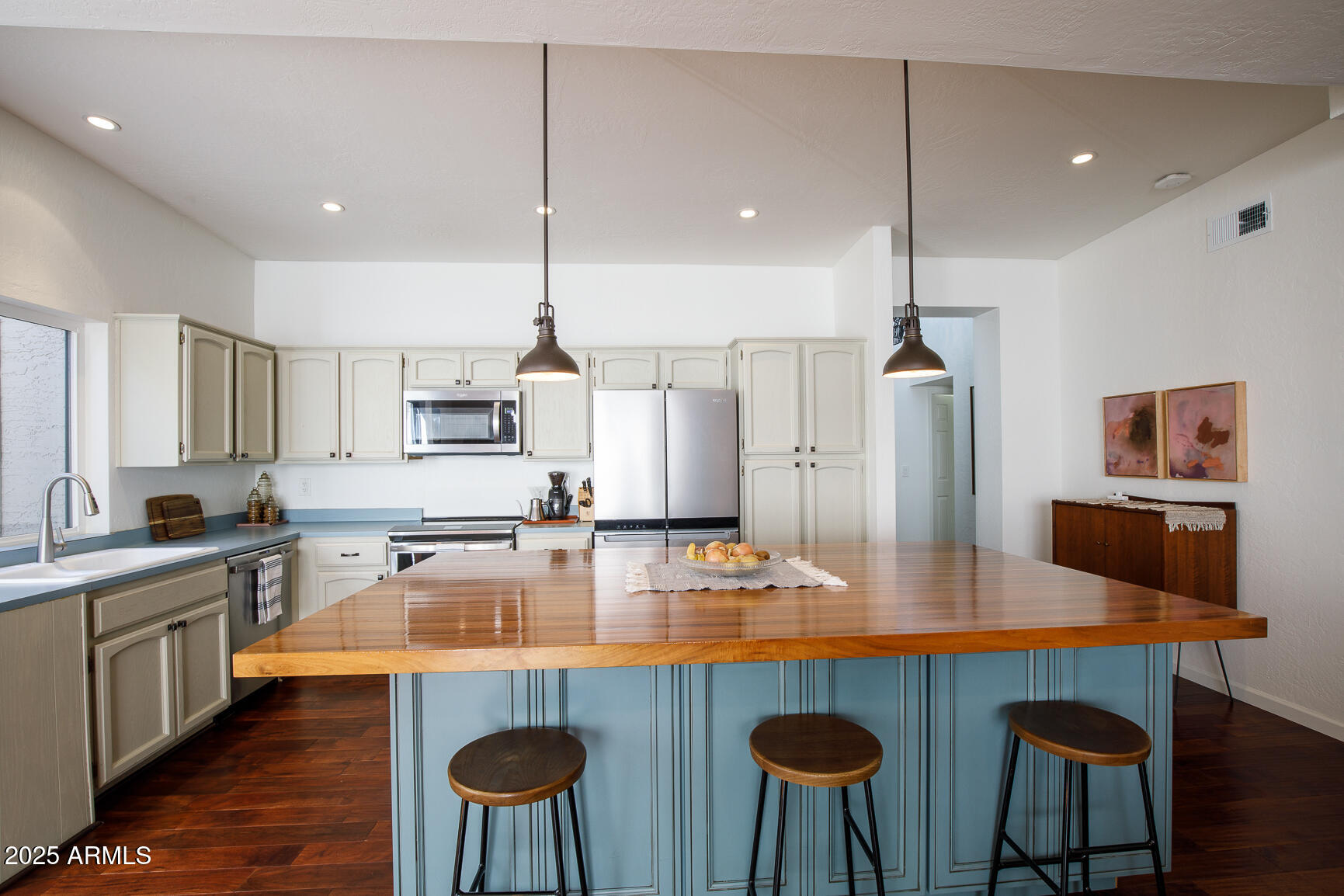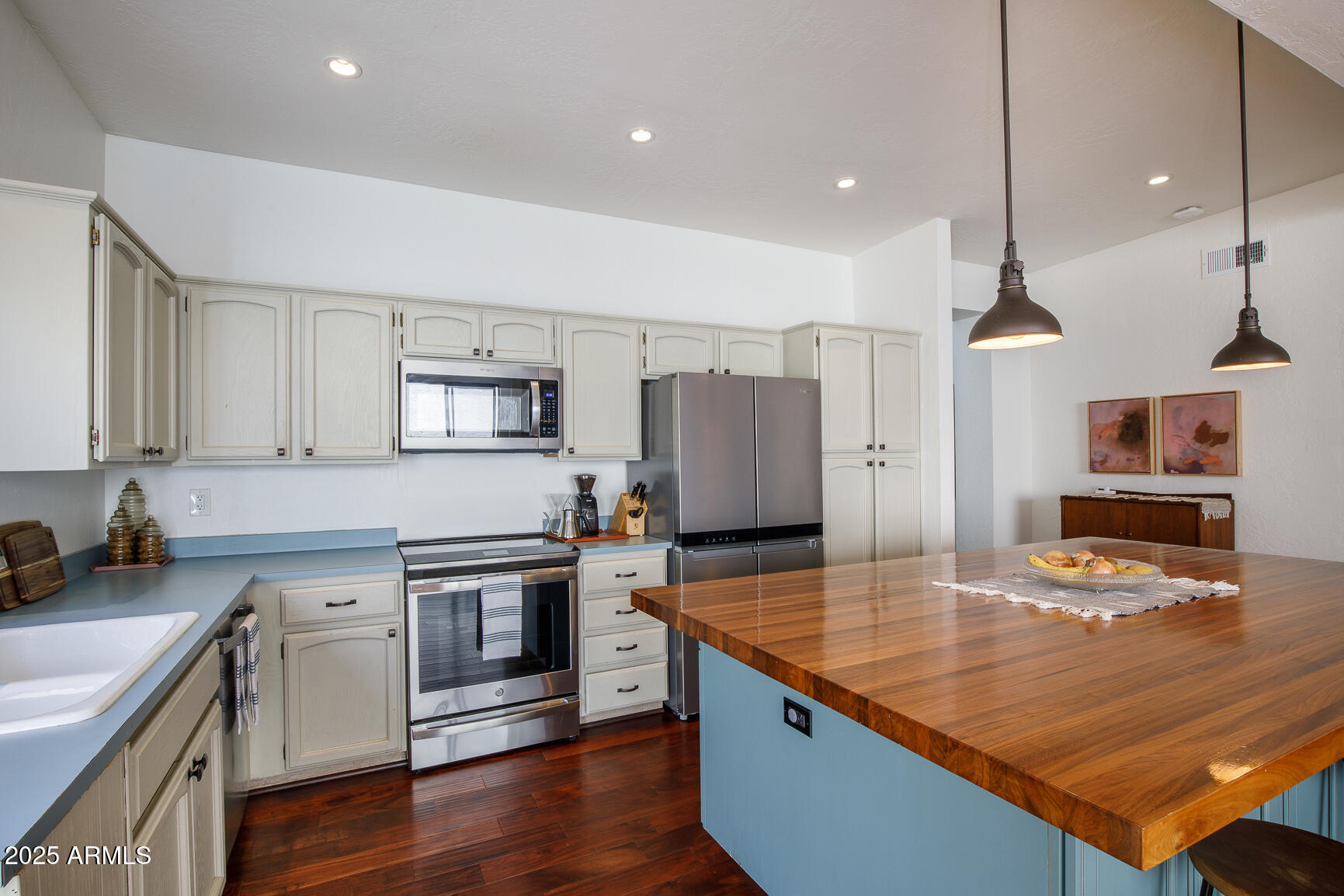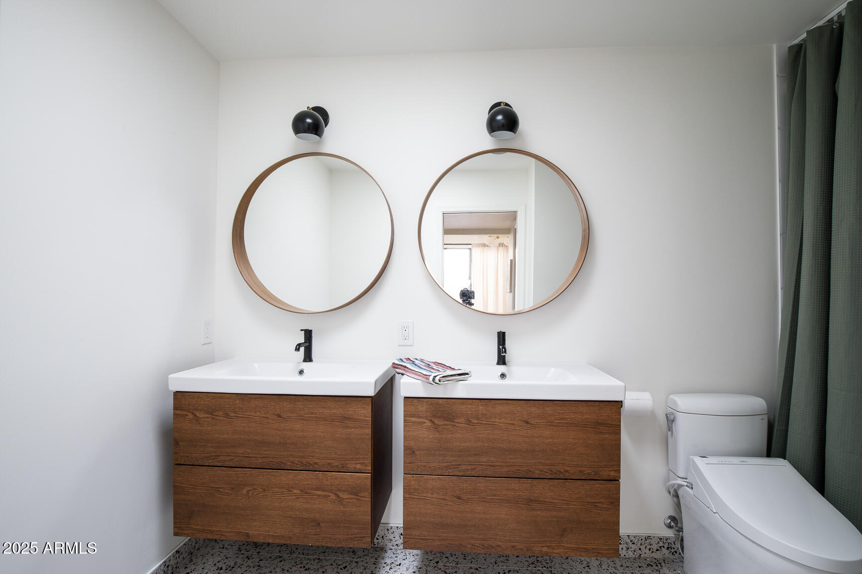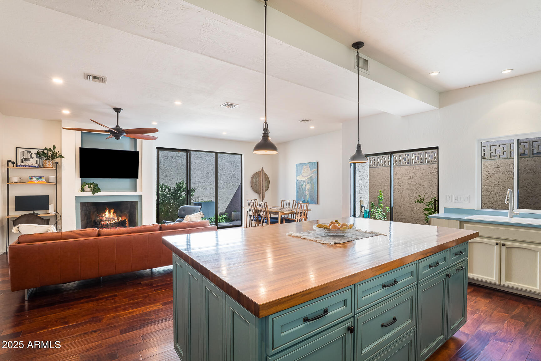 Beautifully maintained 2BR/2BA patio home with open-concept layout, spacious 2-car garage, and modern upgrades throughout. Light-filled interior features a stunning kitchen with custom wood island, fully renovated bathrooms, and thoughtfully designed closets for efficient storage. Large windows and sliders bring in abundant natural light.Roof has had 3 recoats (last in 2024) + new tile roof over entry. Epoxied garage includes EV charger outlet and pull-down access to a cedar-lined, carpeted attic with lighting.Estate Monterra offers a private park and community pool. Prime location near Granada Park with direct access to AZ Canal trails leading to Biltmore, Arcadia, PV & Tempe -- perfect for walking, biking, and outdoor living.